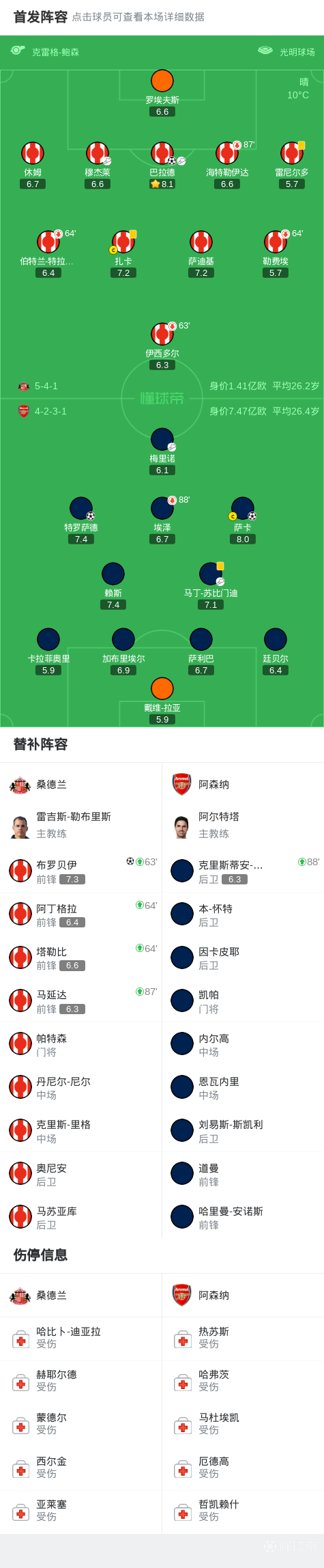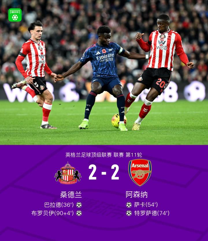 北京時間11月9日1:30,英超第11輪激戰(zhàn)正酣,阿森納客場挑戰(zhàn)桑德蘭,主裁判克雷格-鮑森執(zhí)法。上半場,穆杰萊妙傳巴拉德破門。下半場,梅里諾助攻薩卡扳平,特羅薩德世界波助阿森納反超;補時階段,布羅貝伊凌空絕平。最終,阿森納客場2-2平桑德蘭,十連勝勢頭被止。